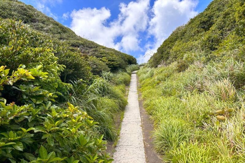 階段を登りきると、道は内陸側へと続き、両側に緑の丘がそびえる細い小道に入っていきます。