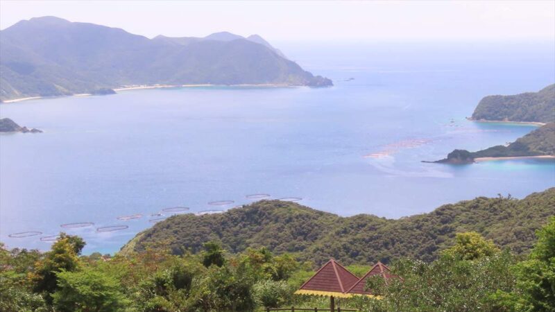 海抜320mの展望デッキからは、複雑に入り組んだ 焼内湾(やけうちわん) を一望でき、奄美大島らしい雄大な自然景観が広がります。